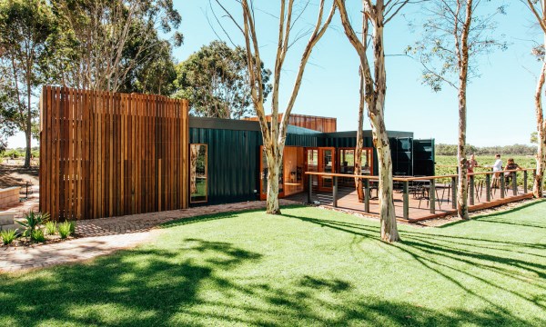 The most prominent clue is the original door of the container, which opens out onto the cellar door’s deck. Within the confines of the balustrade, a Eucalyptus tree sprouts through the deck boards.