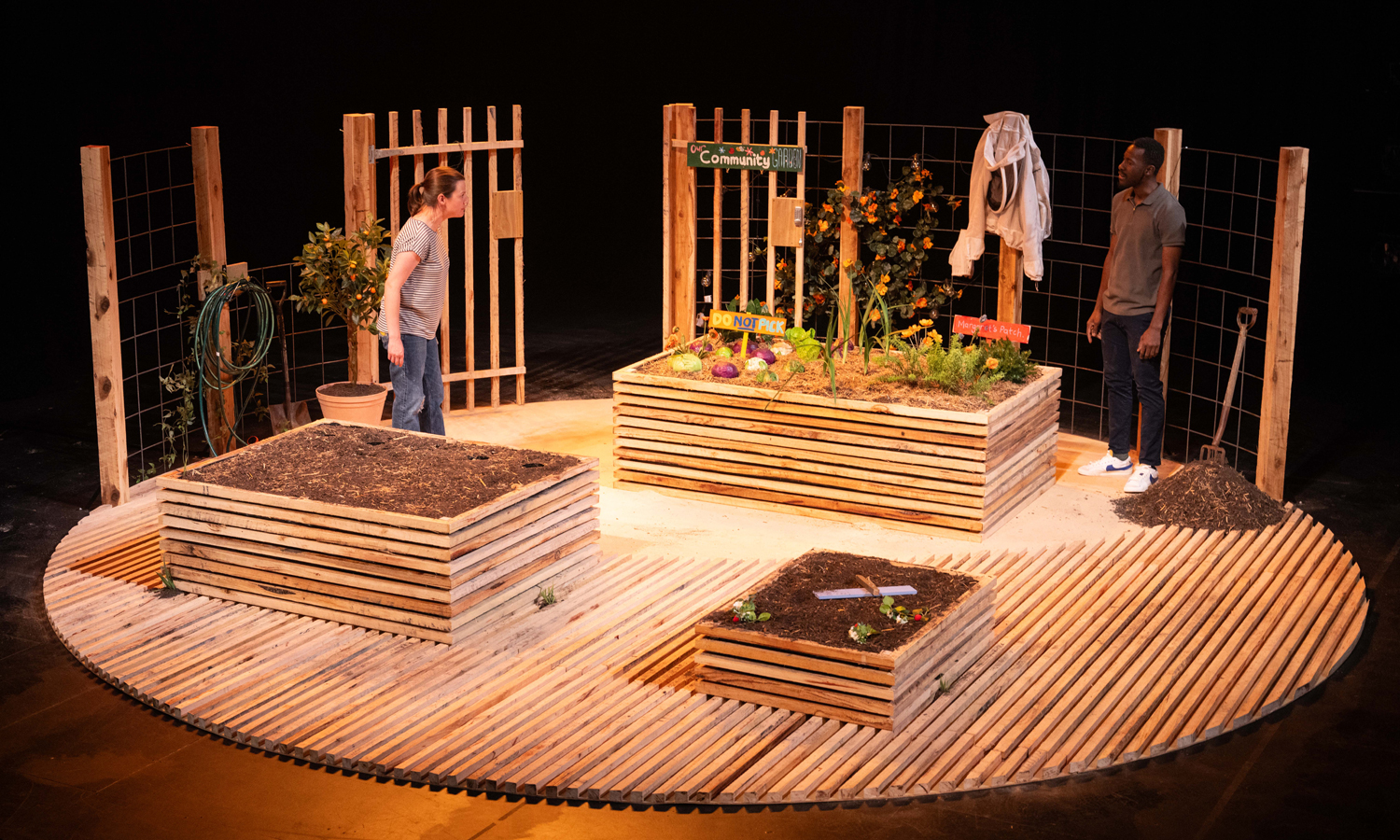 Theatre Republic director Corey McMahon has again produced a brisk, deftly integrated production. Meg Wilson’s set, consisting of a decking floor and raised wooden garden beds with a part-finished wooden slat and wire fence, provides an earthy but well-resourced reality, sumptuously lit by Chris Petridis.
