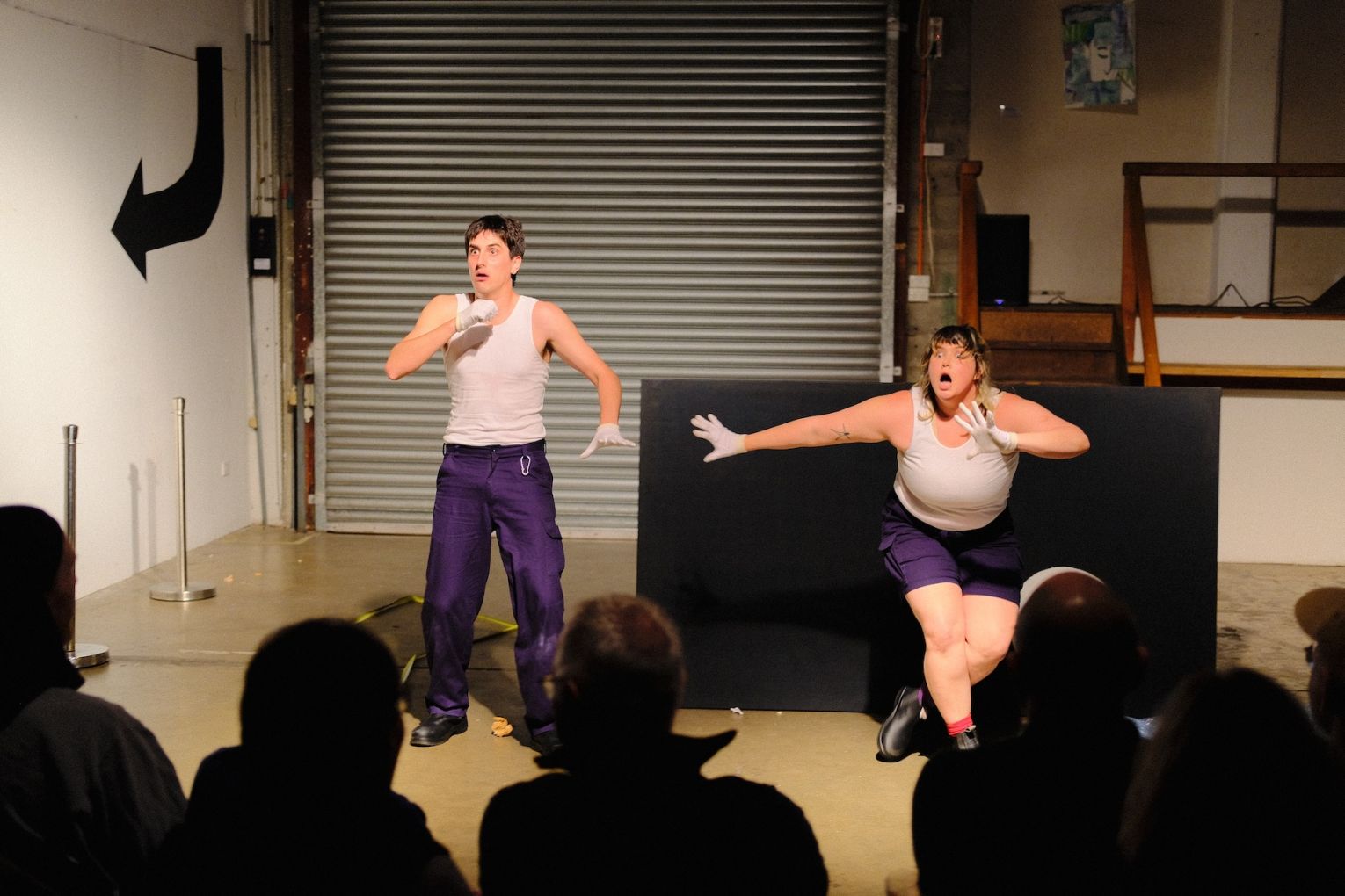 Several of these automatic limbic reactions are present in Masterpiece, the debut work of Australian clown duo Rae Colquhoun-Fairweather and Will Bartolo. Otherwise known as raeandwill, the duo borrows meticulously from their spiritual antecedents, like Jacques Tati and Rowan Atkinson, as their art installer characters attempt to hang a canvas painting on a wall for an hour.