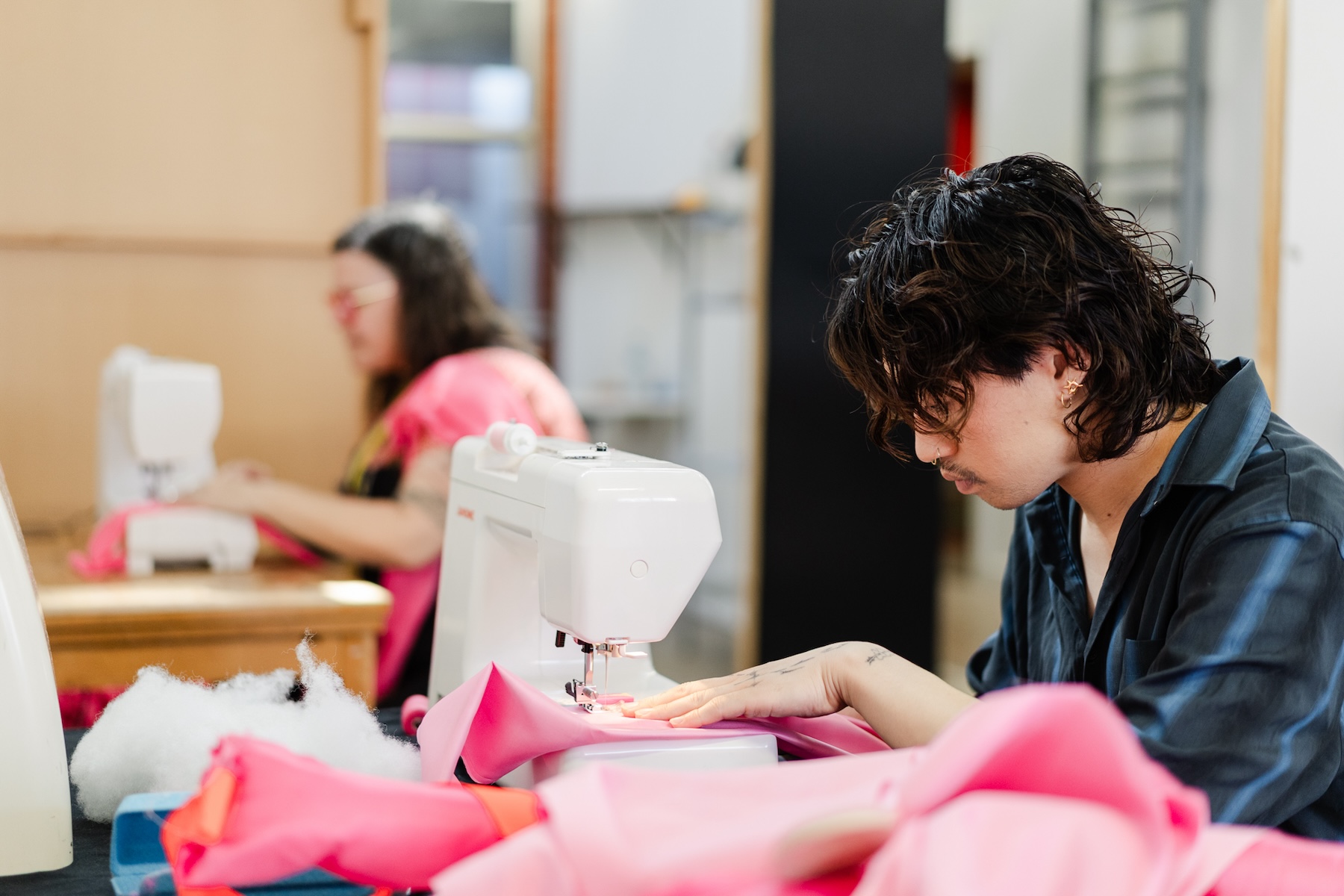 Students from South Australian School and Services for the Visually Impaired (SASSVI) created wayfinding to help visitors navigate the exhibition, and took part in sewing workshops where they made what Michaels describes as “long threads” – 3-metre-long tubes of fabric with stuffing inside that hang from the gallery ceiling.