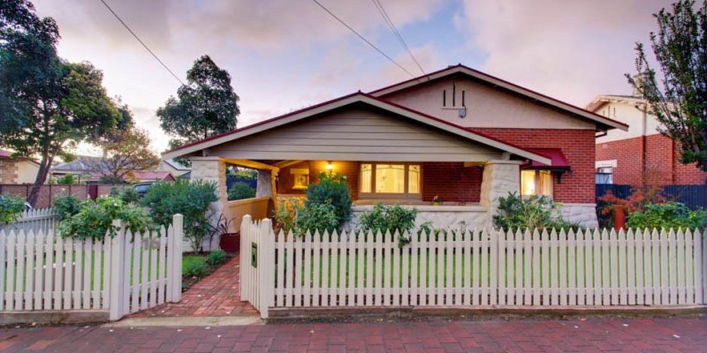 This four-bedroom 1925 bungalow has been fully refurbished and includes both contemporary and original features. There are polished boards and parquetry, striking fireplaces, lead-light windows and lofty ceilings. The front of the property comprises three bedrooms – two featuring character fireplaces – with built-in robes and a family bathroom. A gourmet kitchen with a large granite bench and stainless-steel appliances is adjacent to an open-plan dining room, while outdoors there is a raised decked and paved meals area.