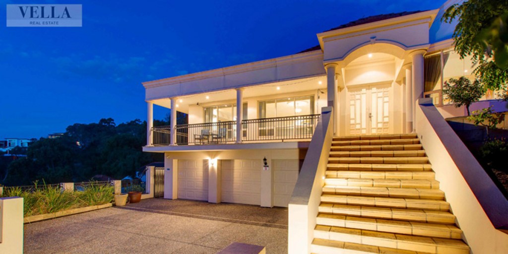 This architecturally designed home is set on an elevated, landscaped allotment of more than 1000sqm. It features an in-ground pool and spa, a terraced outdoor entertaining area and five-car garaging. The large lounge/dining area has dome ceilings and polished Kerri timber floors, and opens to a luxury kitchen with Belfast black granite benchtops and spashbacks. There are four double bedrooms. The main bedroom has a bay window, huge walk-in robe and en suite, including a spa bath.