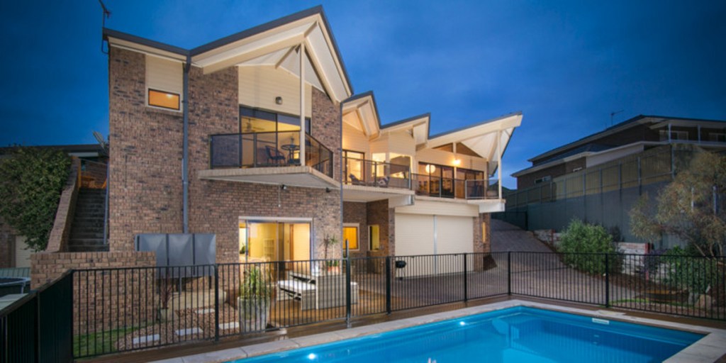 This architecturally designed, two-storey home is located in a cul-de-sac. The house features spectacular views of the city and a timber-decked, salt-water pool. The upper level includes a spacious lounge room with an angular cedar ceiling and a modern fireplace. The kitchen has Essastone benchtops, stainless-steel appliances and downlights.