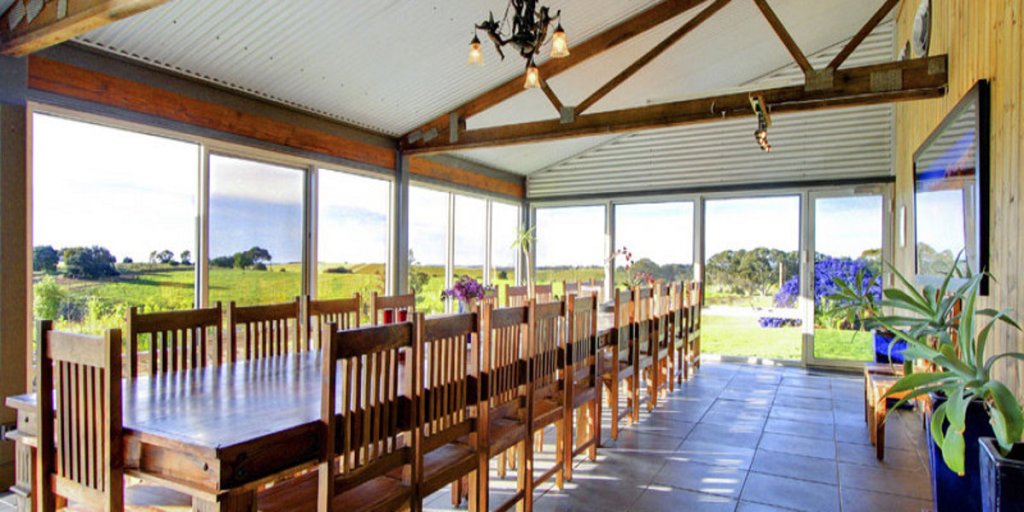 The architecture of this house epitomises open plan living and bringing the outdoors in. Set on almost nine hectares of fertile land – with an orchard of fruit and nut trees – the house contains a semi-commercial kitchen with Mintaro slate bench tops. The master bedroom features three cathedral windows to capture the morning eastern sunlight.