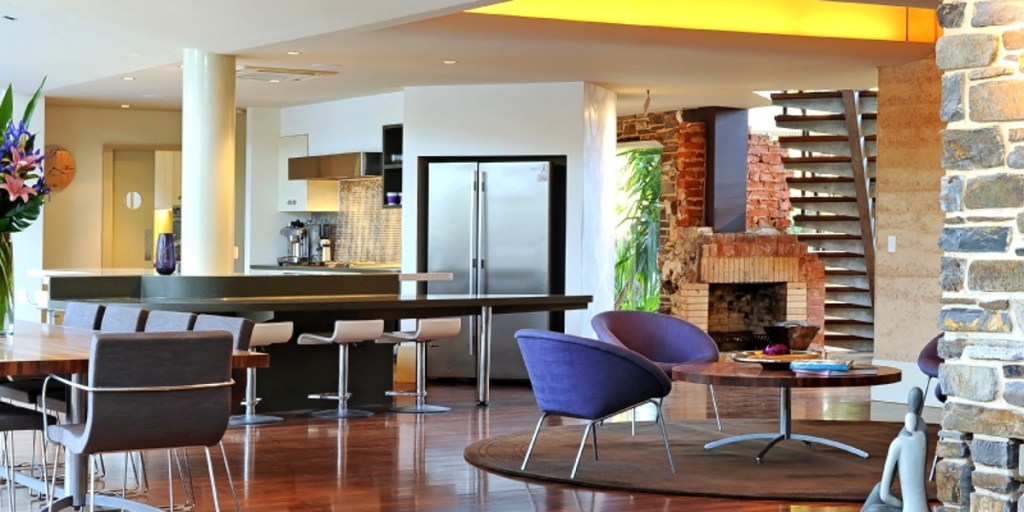 This modern residence is stylish and decadent. The airy, pavilion-style architecture uses rammed earth, stone, glass and timber to create a warm, sleek, light-filled atmosphere that embraces the outdoors. It features a 25m-long lap pool, a home theatre and state-of-the-art kitchen.