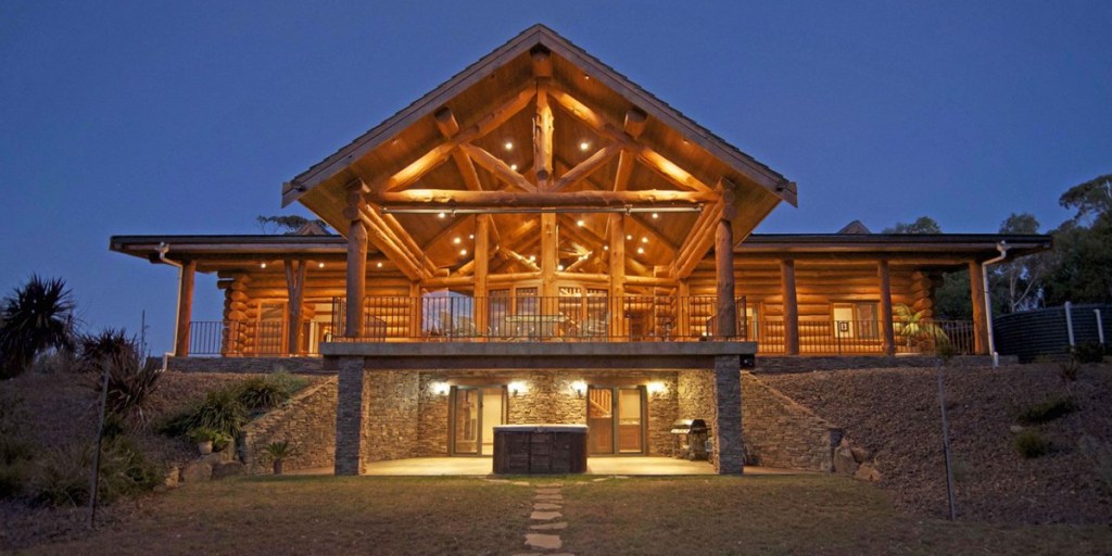 This spectacular home is all about the timber. Huge pine logs were used to construct the three-storey house with tall ceilings and large, double-glazed windows, set on four hectares of land. Downstairs, there is a double bedroom, a sauna, luxurious bathroom and bar. The main bedroom is beautifully appointed with dual-entry walk-in robes, an en suite and access to the front entertaining deck through double red-cedar doors.