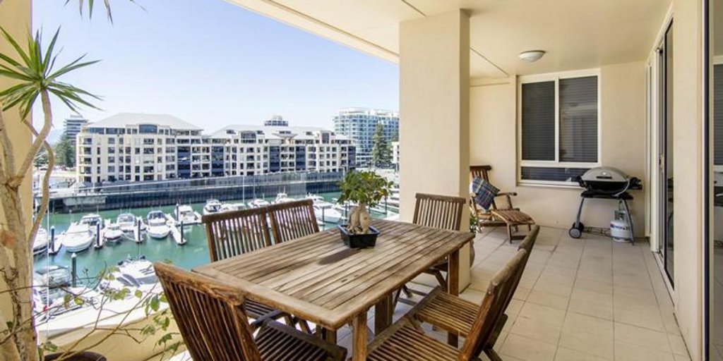 This three-bedroom home overlooks a marina pier. The large casual living area opens to a spacious terrace balcony, and the master bedroom features a large en suite with classic marble finishes.