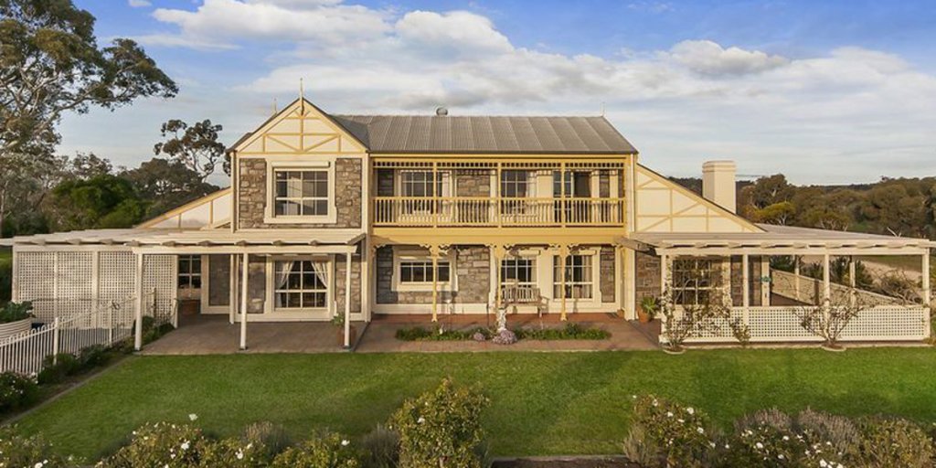This two-storey property has a bluestone façade and 360-degree views over Angaston and its surrounds. The kitchen is equipped with solid Canadian maple cabinetry, top-of-the range appliances, granite benchtops and a walk-in pantry. A recreation room includes a wood fireplace and a solid Canadian maple wooden bar for entertaining. The room leads to self-contained living quarters with a modern en suite, kitchenette and split-system air-conditioning.