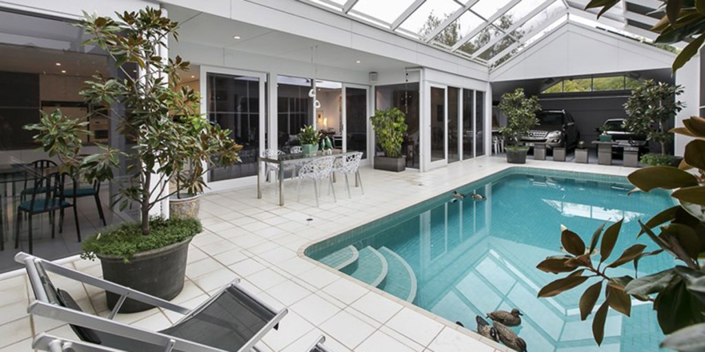 This contemporary house features light-filled, open-plan spaces. A generous dining room, family room and galley kitchen overlook a solar-heated in-ground pool.  Other features include under-floor heating, electronic front gates and ducted evaporative cooling.