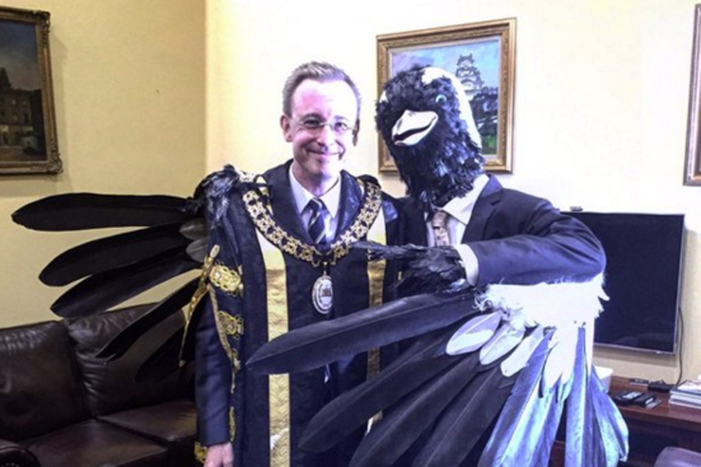 Lord Mayor Martin Haese and his deputy Houssam Abiad had “no idea” they were taking part in a guerrilla marketing campaign for a commercial financial institution when they agreed to an exclusive Town Hall meeting with a man in a giant bird suit.