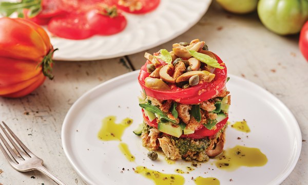 Set tomato stack on plate and surround with remaining salad and caper berries. Drizzle with oil from the rocket pesto and sprinkle with caper salt.