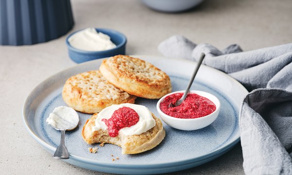 Wake up this weekend with a slow breakfast of crumpets with a tangy raspberry chia jam – well worth making from scratch.